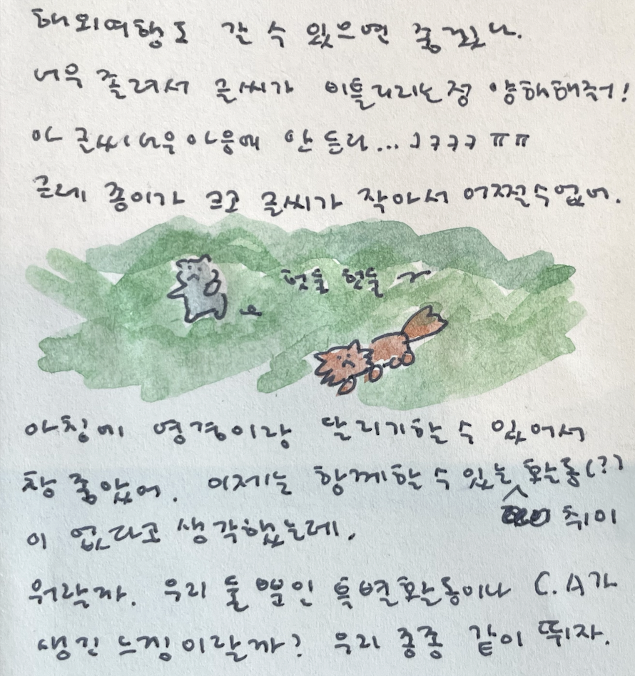μ¬λ¦ν΄κ° λ§μ§λ§ λ , μ°λ¦¬λ 20λ μ μ²λΌ λ‘€λ§νμ΄νΌ νΈμ§λ₯Ό μΌλ€. μ§μΌλ‘ λμμμ μκ²½μ΄μ νΈμ§λ₯Ό μ½λ€κ° μμ μΈμλ€. λλ¬Όμ νμΉλ©° μ΄ μΌκΈ°μ ν νμ΄μ§λ€.